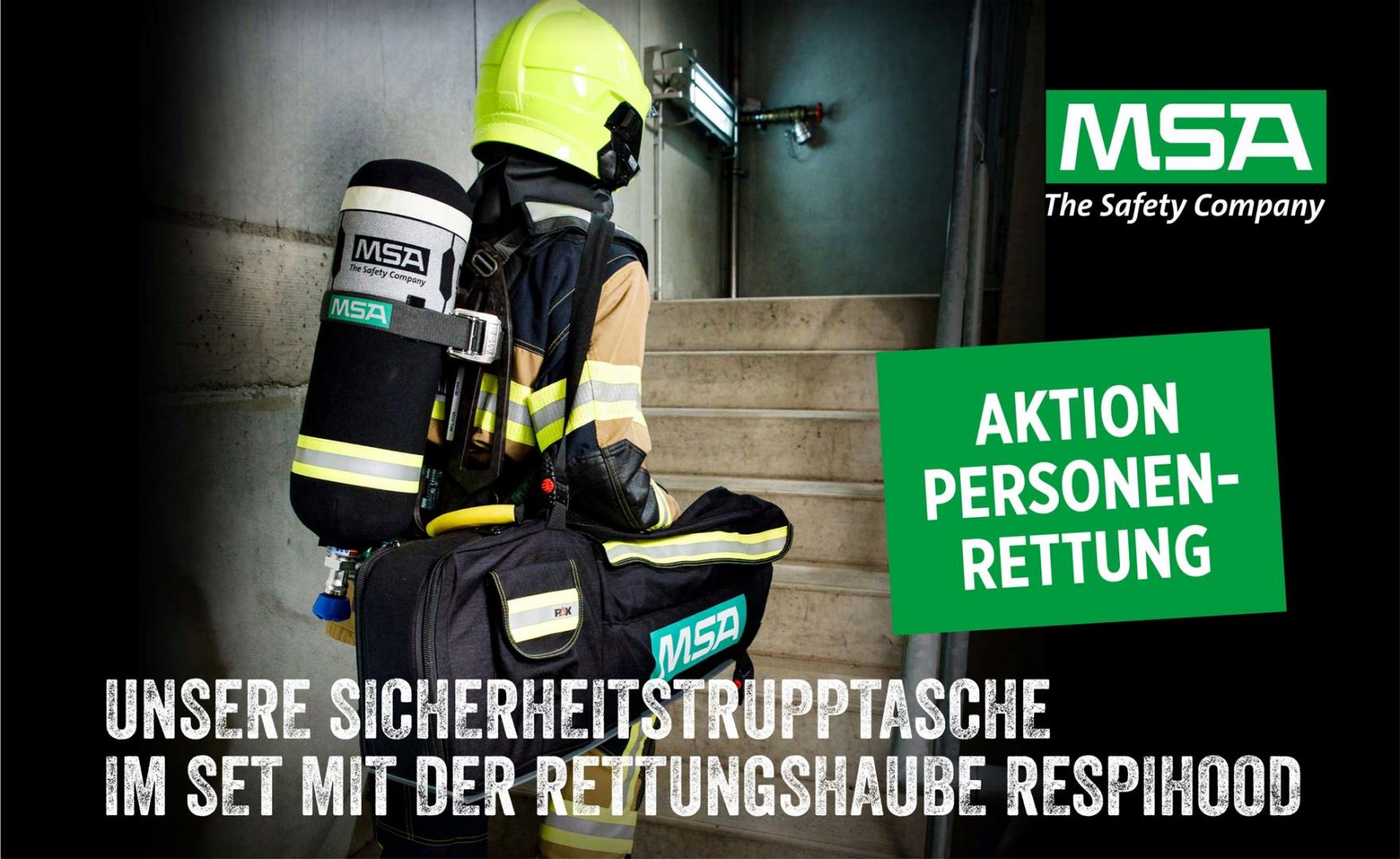 Die aus robustem PAX®-Dura Material gefertigte Sicherheitstrupptasche wird von einer Einsatzkraft getragen und versorgt eine Person in Notlage mit Atemluft.